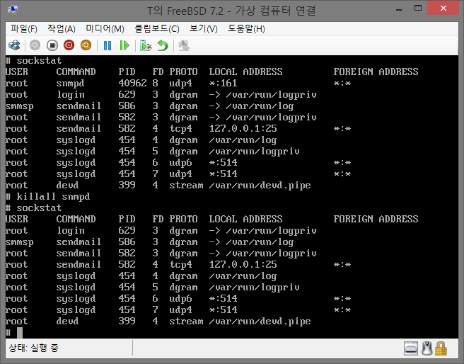 최초 설치 후 snmpd를 실행하고 아직 종료를 안 했으니 kill 혹은 killall로 종료시켜 줍니다.